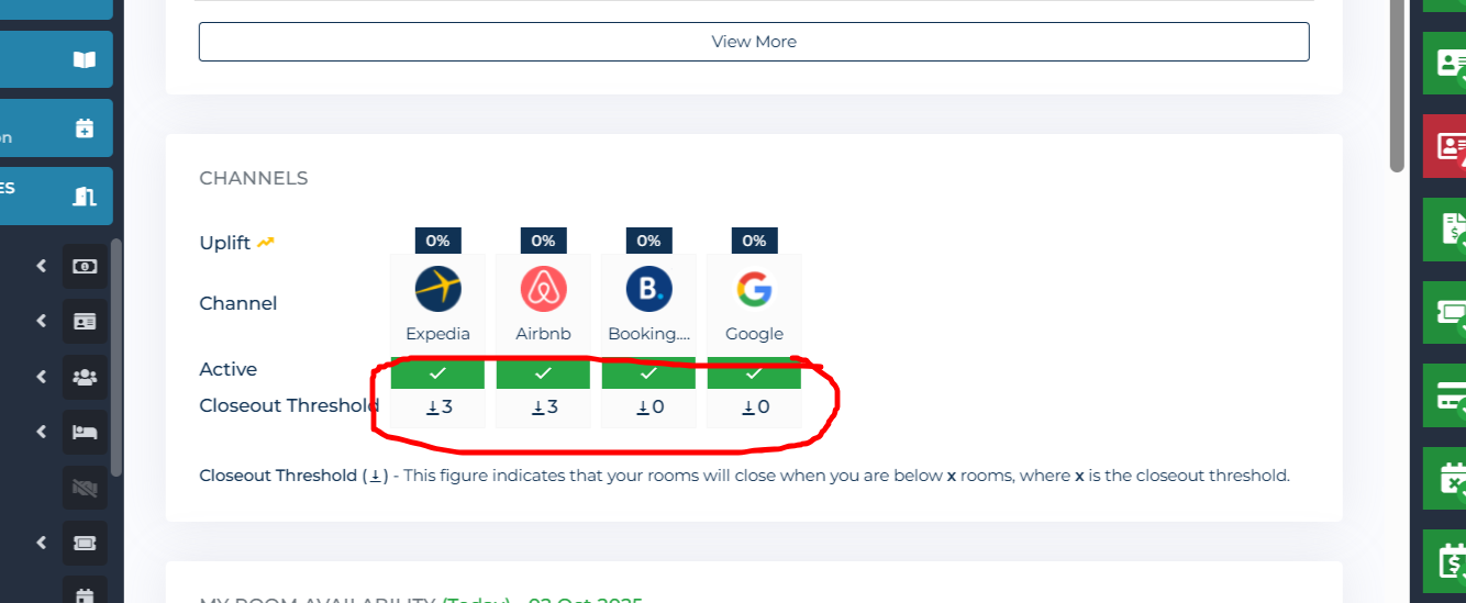 On the Dashboard page of GuestDiary System you will see a chart (see below). In this example the property has elected to closeout Expedia and Airbnb when they have just 2 rooms left (below 3). This property has elected to do this when they have 2 rooms left because they are close to an airport and are susceptible to a large volume of last minute bookings if a flight is cancelled.